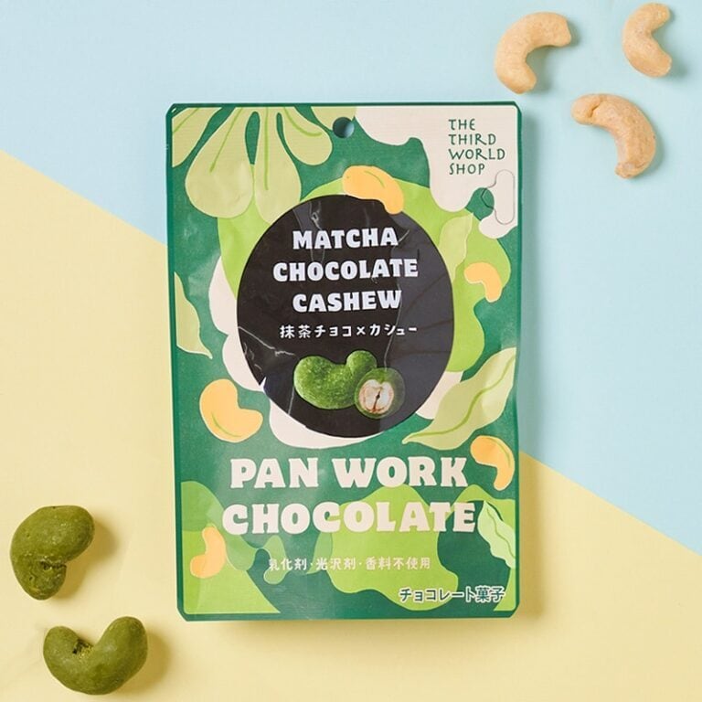 サクサクの衣で包んだカシューナッツを抹茶入りのホワイトクーベルチュールチョコでコーティング。